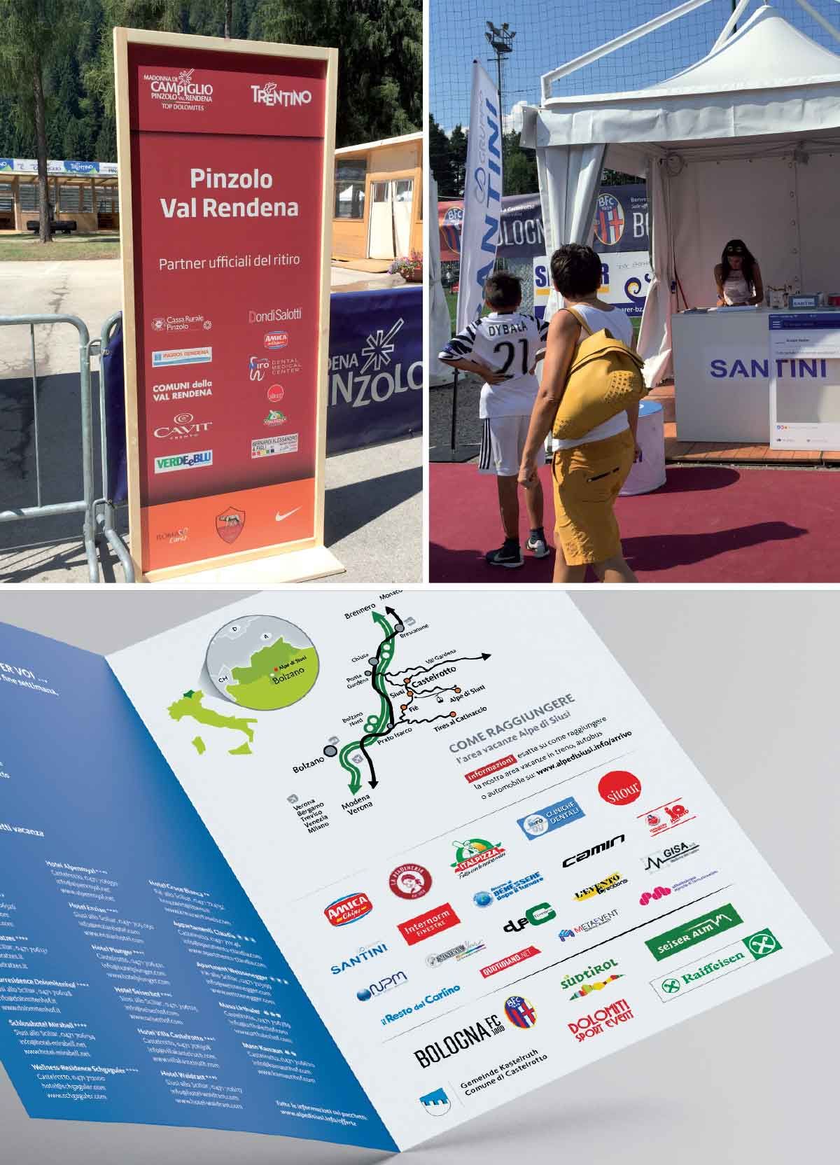 Le locandine, le brochure informative cartacee e digitali a disposizione dei tifosi/turisti, i totem all’ingresso delle varie aree dei Ritiri, saranno brandizzati anche con il Vostro logo.